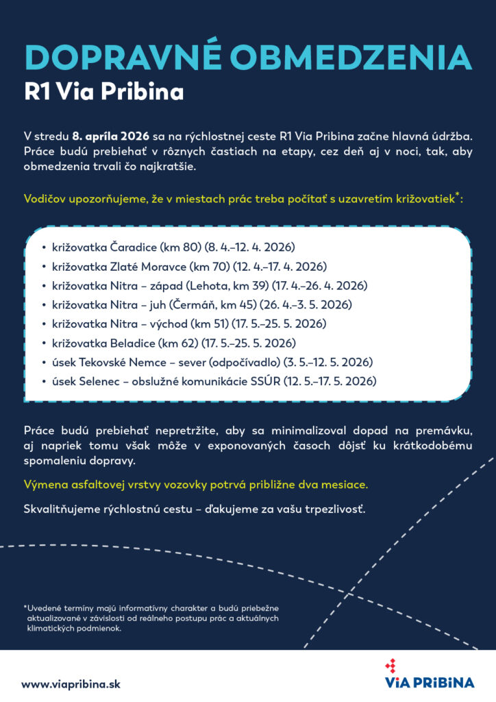 V stredu 8. apríla 2026 sa na rýchlostnej ceste R1 Via Pribina začne hlavná údržba. Práce budú prebiehať v rôznych častiach na etapy, cez deň aj v noci, tak, aby obmedzenia trvali čo najkratšie.